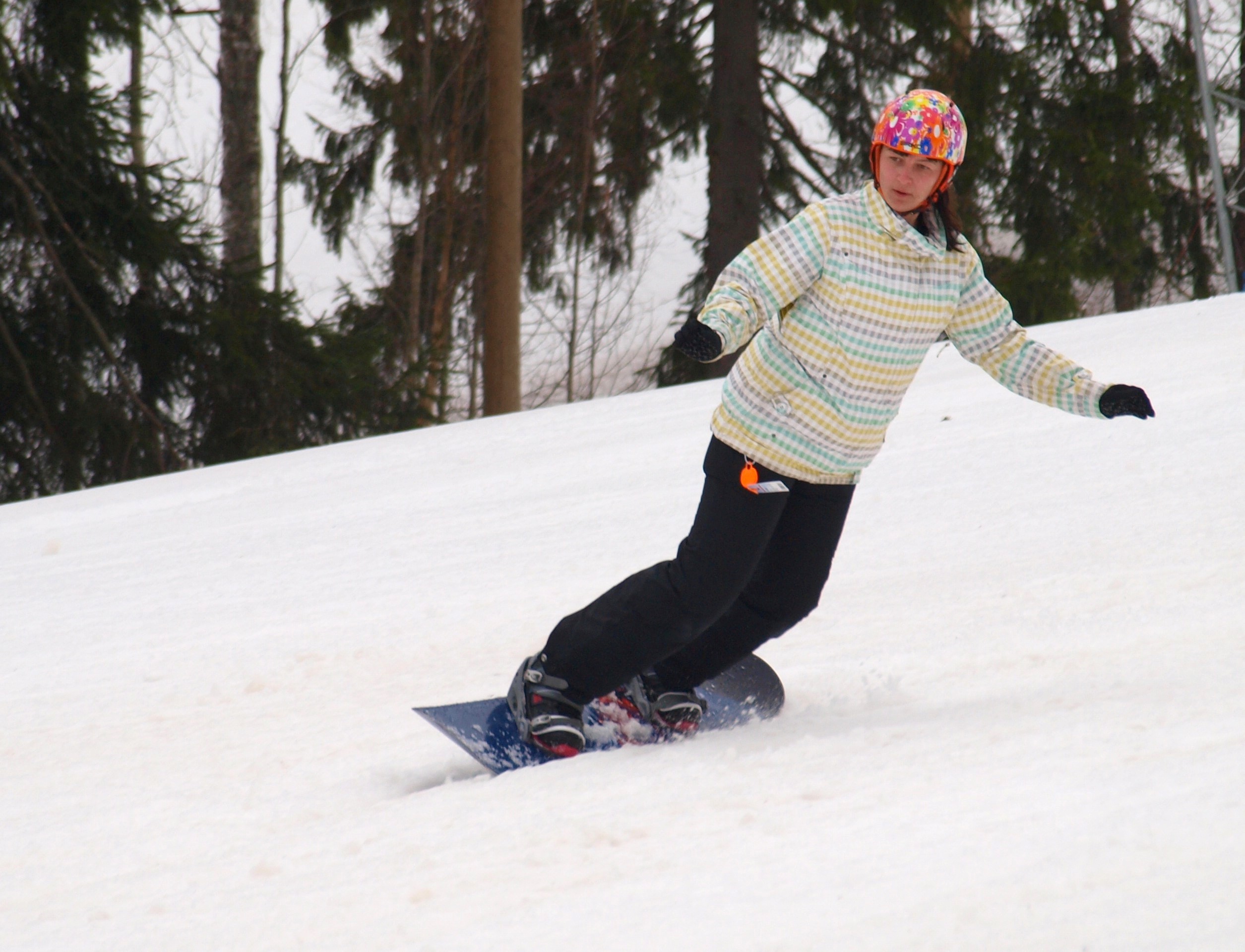 Всего через год и пару выездных школ, та же Маша на склоне в Золотой долине, Коробицыно, Лен. обл. Поворот бэк-сайд – казалось бы, ничего сложного – садись назад, доска сама и повернёт. В целом, так и есть, хотя нюансов… много.